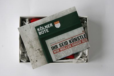 Der Kartondeckel ist mit einem gestempelten roten Kölner Stadtwappen versehen.